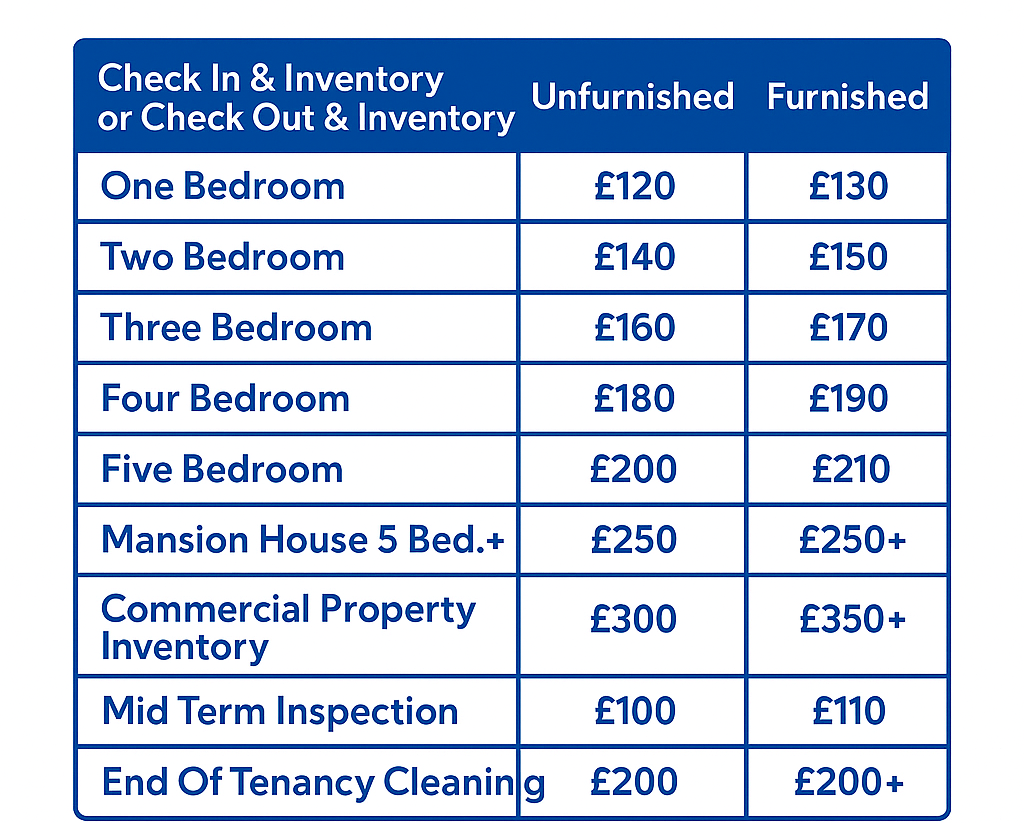 Additional rooms such as extra reception, en-suites, conservatories etc.. will be charged £10 per room.
